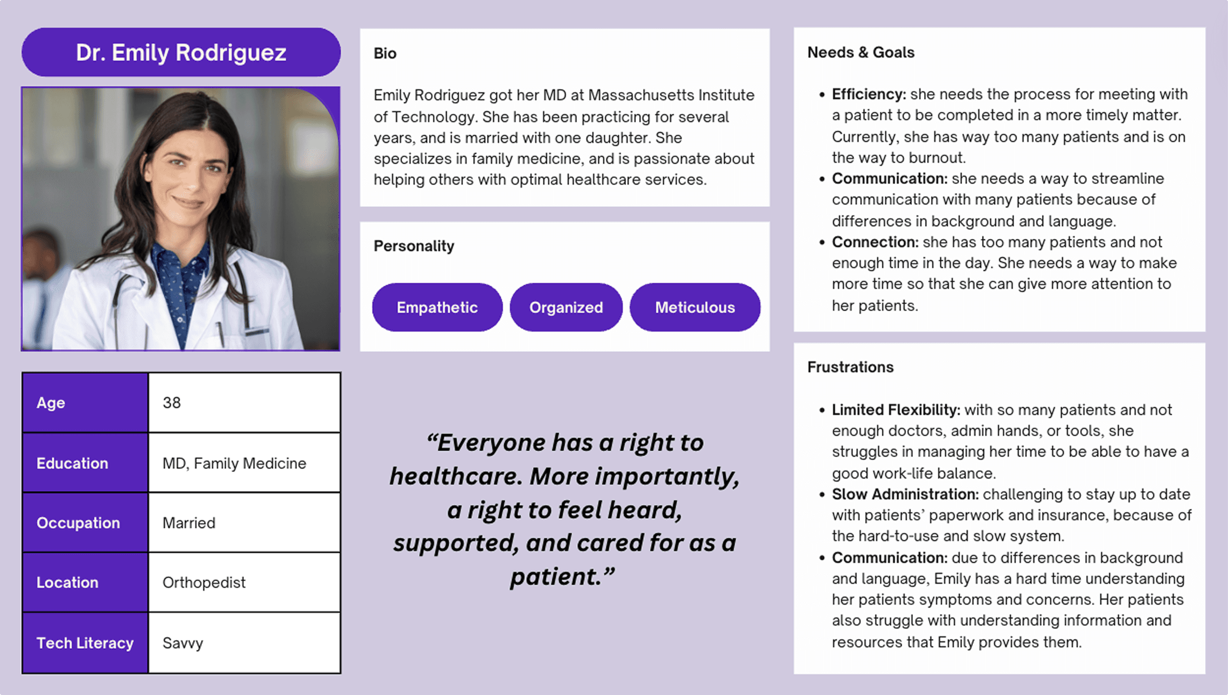 After discussing the target demographic with the client, the team created a persona for a potential CareWallet user. From this process, we incorporated common decision-making patterns and frustrations among healthcare providers in the desktop app to create a tailored and seamless user experience.